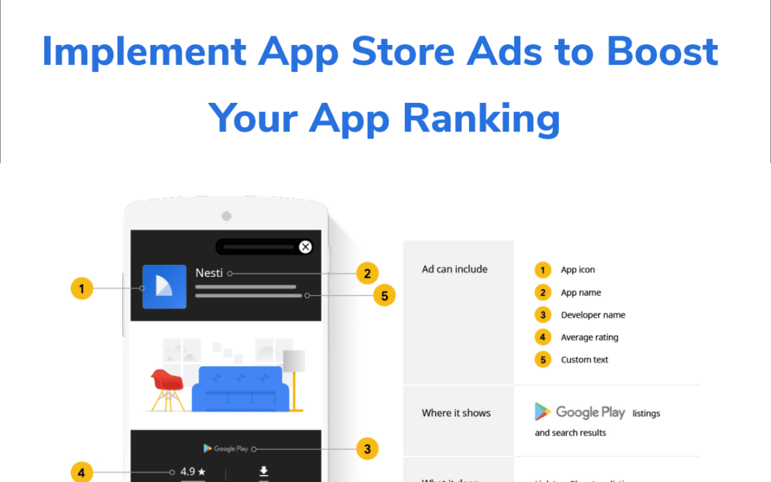 Apple y Google Play Store le permiten anunciar su app en la app store. Estos anuncios aparecen en la parte superior con una etiqueta de «anuncio», que aparece incluso antes de la app mejor clasificada.